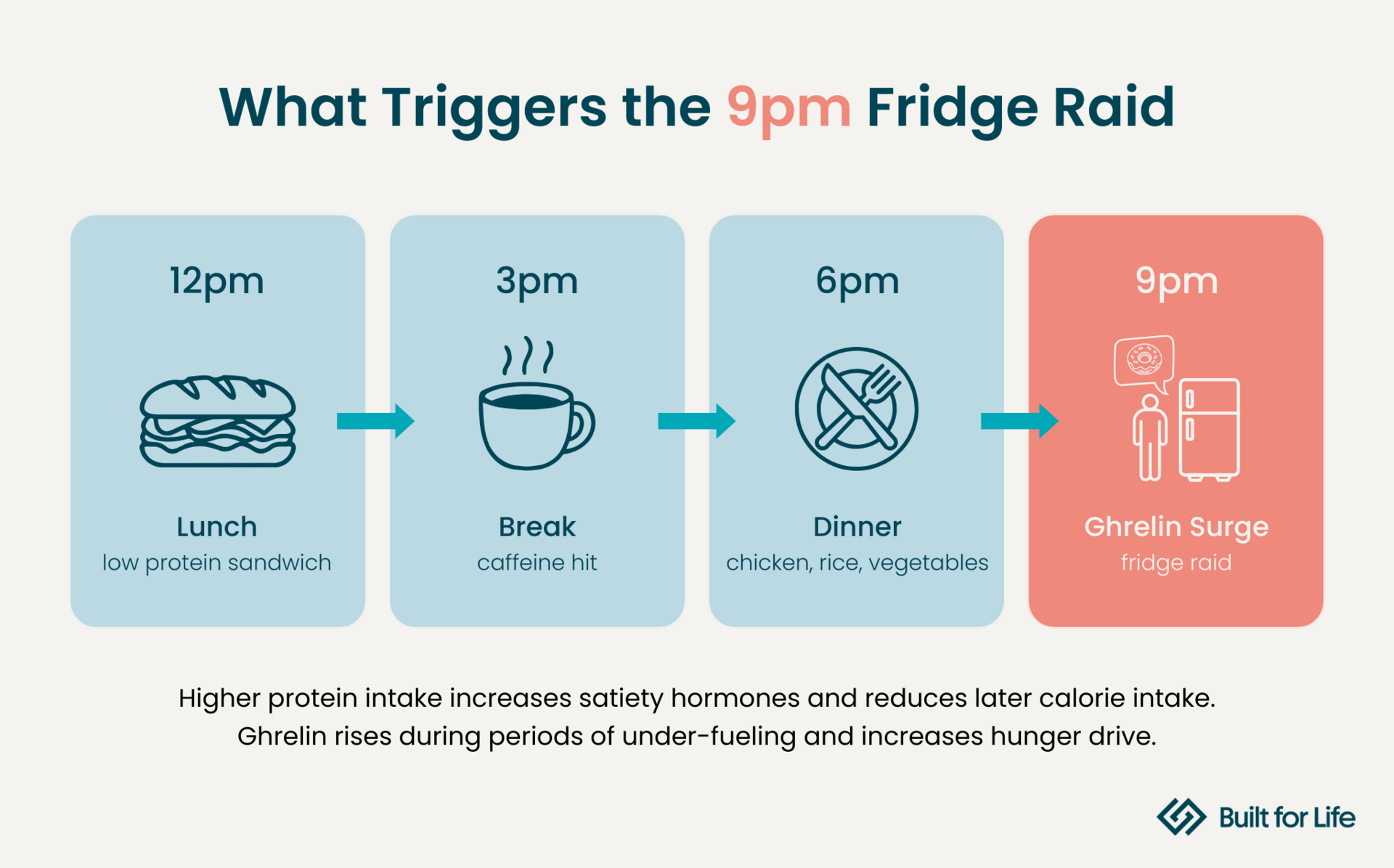 9pm: BOOM. Ghrelin spikes. Your body finally catches up and realizes you've been running on fumes all day. Now it wants everything.