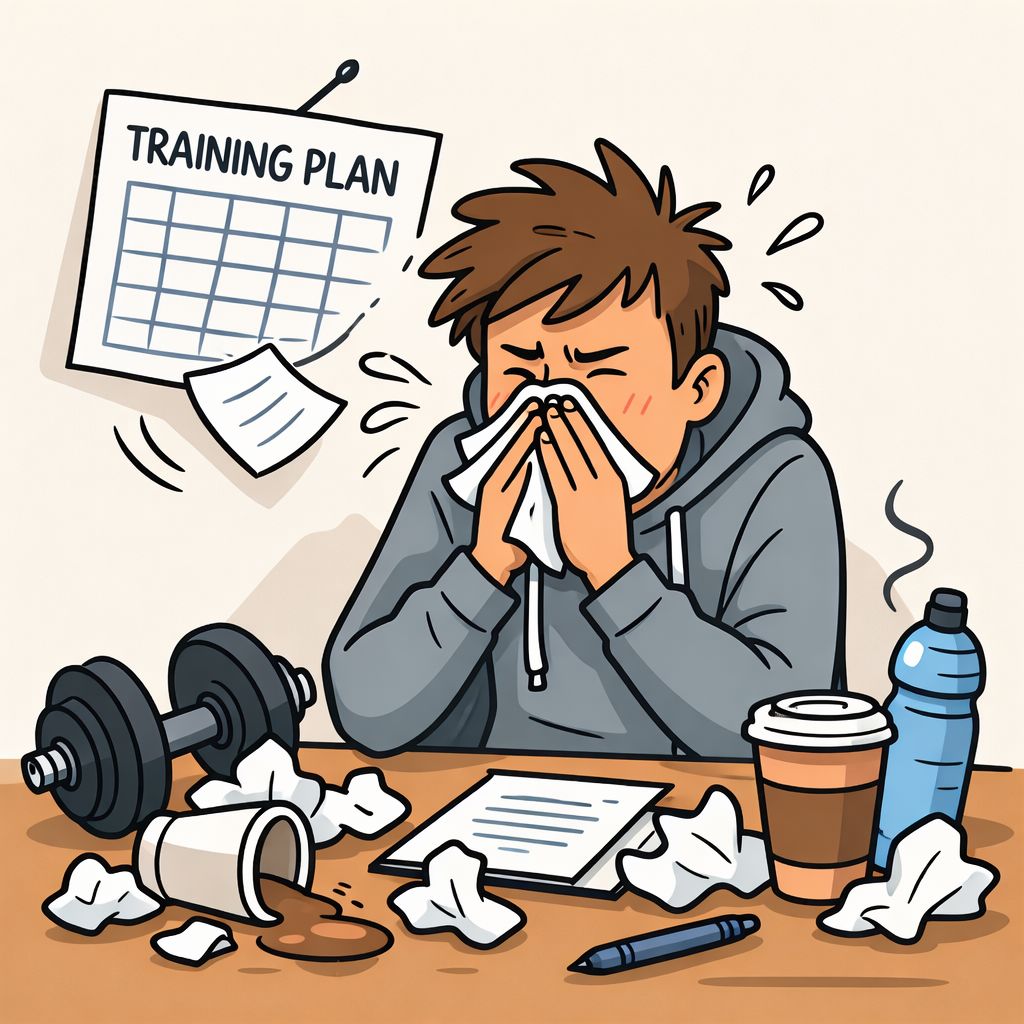 Most people pick A. It feels like the disciplined choice. It's not. Pushing through when your immune system is already low makes you sicker for longer and costs you more time than a rest day ever would. B is better but incomplete. C is the right answer. A lighter session keeps the habit, tells your body you're listening, and getting to bed early is where the actual recovery happens.